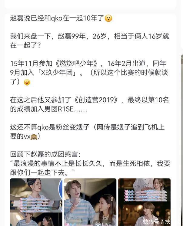 赵磊说不能播,但姜潮还是了解节目组的,毕竟这么值得讨论的话题,节目组怎么可能浪费素材呢!果不其然,节目片段播出后迅速引发了网友们对赵磊的吐槽! 交往十年,那就说明他们两人在一起的时候,赵磊才16岁!网友整理了一下赵磊出道的时间线,他15岁参加《燃烧吧少年》,16年2月份的时候加入X玖少年团出道!所以当时还在比赛期间的他就已经美美的谈上恋爱了!